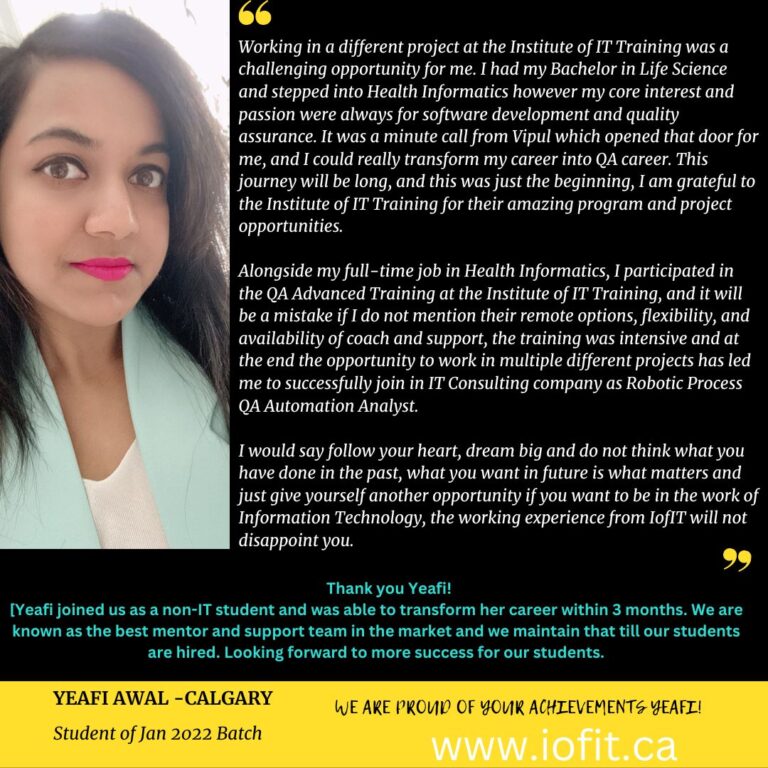 First: You should spend your time and money by considering your career goal. When your goal is to get an entry-level job, why should you pay a lot in fees and also spend 12+ months in training? The ultimate goal of each student is to learn IT program’s as fast practically with projects and be ready for IT jobs. Second: You do not learn projects/assignments with real-time examples at bigger places. At IOFIT, you learn all programs based on real-time projects only. Third: Our focus is to train and help you for placement no matter what your education/experience background Fourth: We have more one-on-one focus due to smaller classroom size Finally: An employer looking for your experience-based knowledge which you gain from projects and not from theories. Your interview is focused on behavioral and technical ‘fit’ with the organization and that is the only way Canadian companies hire IT, professionals.